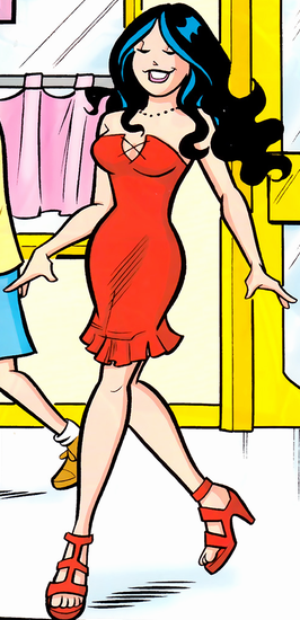She has dark shading hair and dark black eyes.